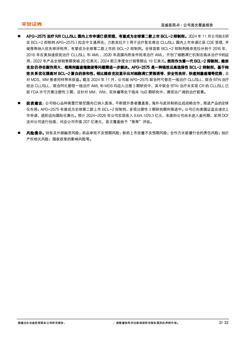 亚盛医药凭借其在细胞凋亡路径和下一代小分子TKI领域的深厚研发实力,成功推动核心产品耐立克和APG-2575的临床开发和商业化进程。耐立克作为国内唯一的第三代BCR-ABL TKI,已通过医保准入并与信达生物合作,同时与武田制药达成全球战略合作,加速其国际化布局,有望在全球CML市场中占据重要地位。APG-2575作为有望成为全球第二款上市的BCL-2抑制剂,在多项血液肿瘤适应症中展现出优异的临床数据和差异化优势。公司在2024年上半年实现首次盈利,并积极推进美国上市申请,进一步巩固其国际化发展战略。尽管公司仍处于研发投入期,但其核心产品的市场潜力、全球化布局以及稳健的财务表现,预示着未来强劲的增长空间。报告基于DCF估值法,给予亚盛医药“推荐”评级,并提示了财务、审批、销售、合作及政策等相关风险。