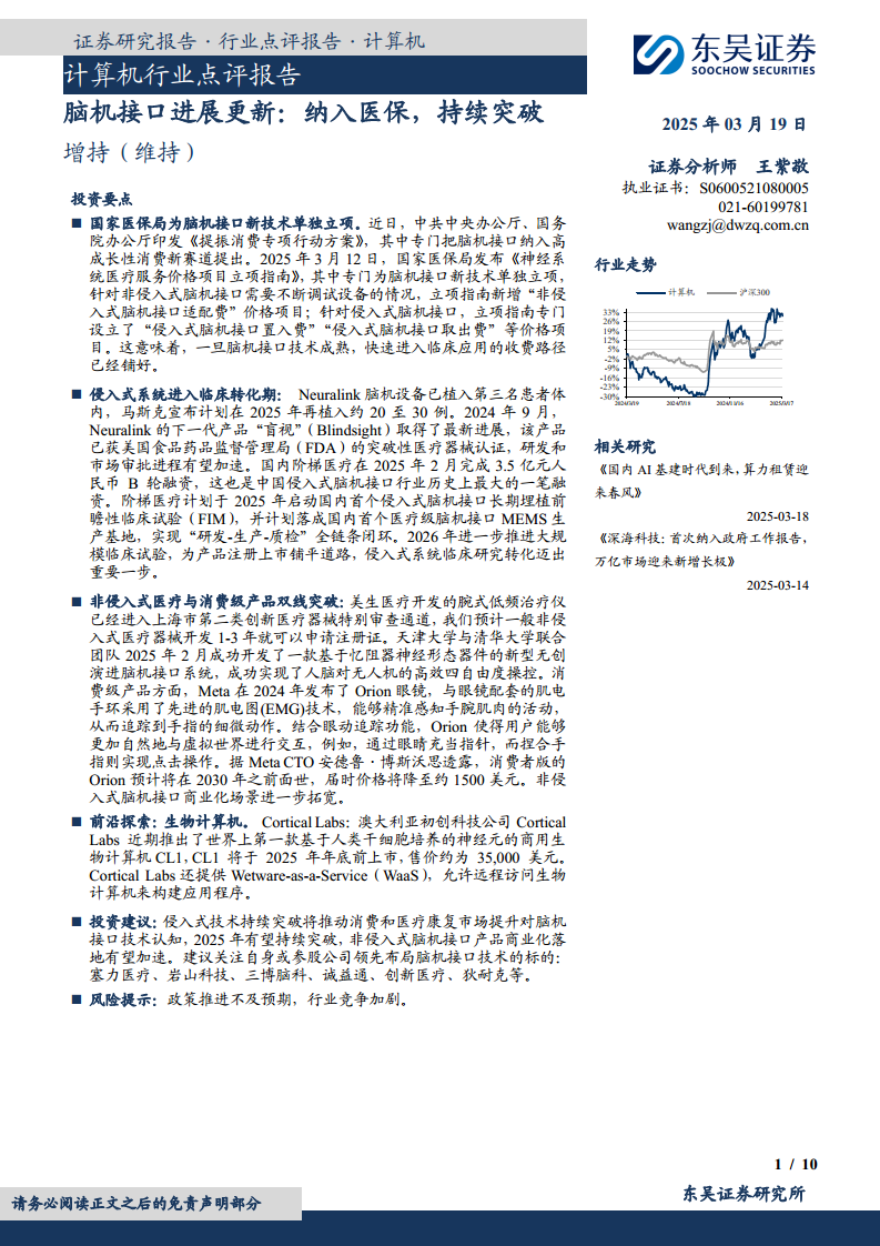 计算机行业点评报告:脑机接口进展更新:纳入医保,持续突破