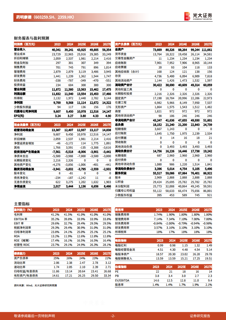 鉴于药明康德TIDES业务的强劲增长势头和产能的快速扩张,分析师上调了公司2025-2026年的归母净利润预测,并新增了2027年的预测。预计2025年、2026年和2027年归母净利润将分别达到109.8亿元(原预测为102.8亿元)、125.2亿元(原预测为111.5亿元)和141.5亿元,分别同比增长16.2%、14.0%和13.0%。根据新的盈利预测,2025-2027年A股对应PE分别为18倍、16倍和14倍;H股对应PE分别为18倍、15倍和14倍。分析师维持公司A股和H股的“买入”评级,肯定了其作为一站式CXO龙头的稳定业绩和增长潜力。