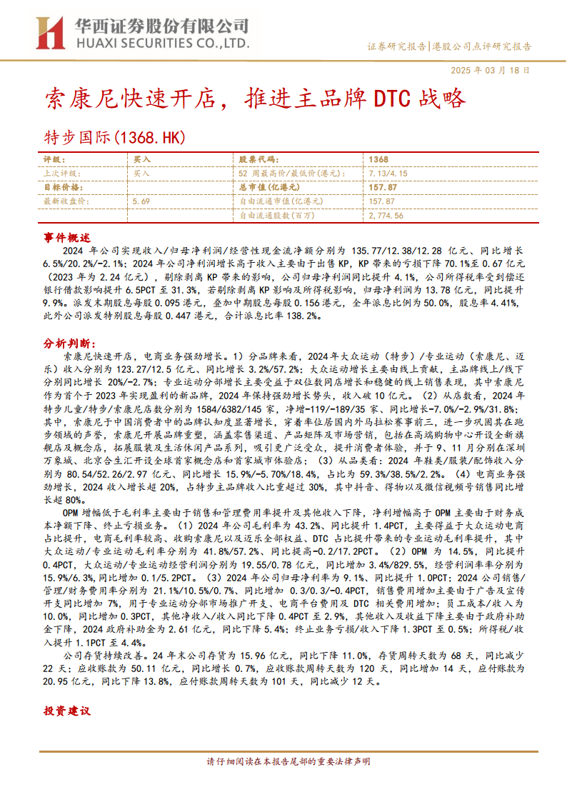 报告强调,索康尼作为专业运动分部的核心品牌,通过快速开店、品牌重塑和产品矩阵拓宽,已成为公司新的增长引擎。同时,主品牌特步的电商业务贡献显著,DTC战略的深入实施将有助于提升品牌忠诚度和运营效率。尽管短期内DTC投入可能对业绩产生影响,但长期来看,这些战略举措将持续驱动公司盈利能力和市场竞争力的提升。