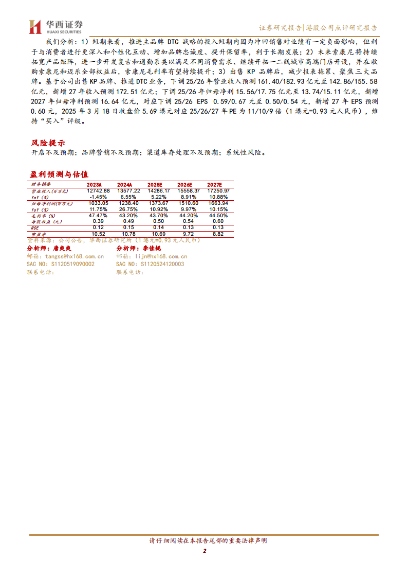 特步国际在2024年展现了稳健的财务表现,收入和归母净利润分别同比增长6.5%和20.2%。这一增长主要得益于专业运动品牌索康尼的强劲增长(收入破10亿元,同比增长57.2%)、电商业务的显著贡献(增长超20%)以及剥离亏损业务KP带来的积极影响。公司通过快速开店、品牌重塑和产品矩阵拓宽,成功提升了索康尼的市场地位和盈利能力。同时,DTC战略的推进和存货管理的持续改善也为公司长期发展奠定了基础。尽管公司下调了未来两年的收入和净利润预测,但基于其清晰的战略方向、专业运动品牌的增长潜力以及DTC模式的长期效益,华西证券维持了“买入”评级,并预计未来几年公司将继续保持盈利增长。