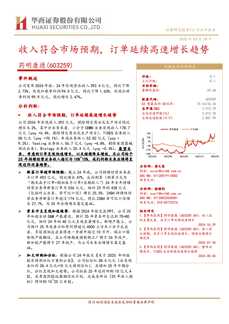 药明康德2024年业绩表现稳健,扣非净利润实现增长,且TIDES等新兴业务展现出强劲的增长势头。公司持续经营业务在手订单大幅增长,为未来业绩提供了坚实支撑。同时,公司通过加速全球产能布局和加大资本开支,积极应对市场需求,并以显著提升的分红和回购力度回馈股东。尽管面临多重风险,分析师仍维持“买入”评级,并对公司未来的盈利能力和增长前景持乐观态度。