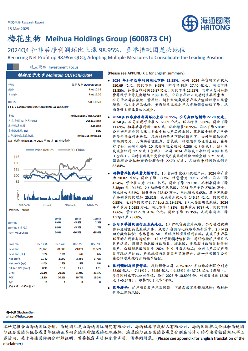 梅花生物(600873):2024Q4扣非后净利润环比上涨98.95%,多举措巩固龙头地位