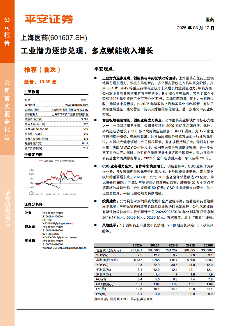 上海医药凭借其深厚的国资背景、全产业链布局以及“工商研投”一体化战略,展现出强大的市场竞争力和增长潜力。公司医药工业板块在创新药研发和中药品牌建设方面双轮驱动,通过重点品种的突破和战略性收并购,不断提升核心竞争力。医药商业板块则在稳定分销业务的基础上,积极发展CSO、创新药服务和器械大健康等新兴业务,实现了商业模式的转型升级和高附加值服务的拓展。尽管2023年受一次性因素影响归母净利润短期承压,但公司费用管控得当,业绩已迅速恢复,预计未来几年将保持较快增长。基于对公司2024-2026年的盈利预测,并考虑到其在全国范围内的商业覆盖优势和工业业务的体量与多样性,报告给予上海医药“推荐”评级,预计2025年归母净利润将达到56.08亿元,市值841.2亿元。公司面临的风险主要包括创新药上市进展不及预期、账期延长以及政策变化等。