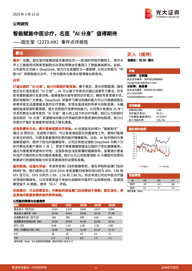 光大证券研究所对固生堂的财务前景持积极态度,并维持“买入”评级。