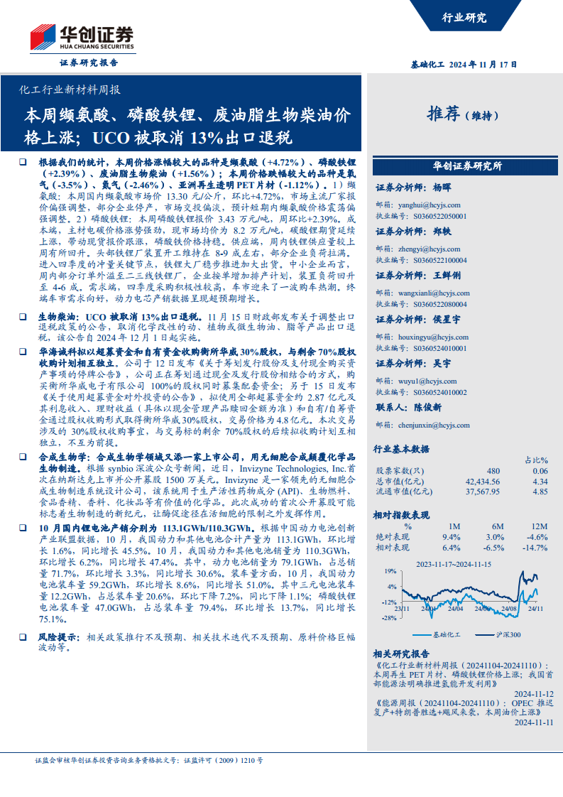 化工行业新材料周报:本周缬氨酸、磷酸铁锂、废油脂生物柴油价格上涨,UCO被取消13%出口退税