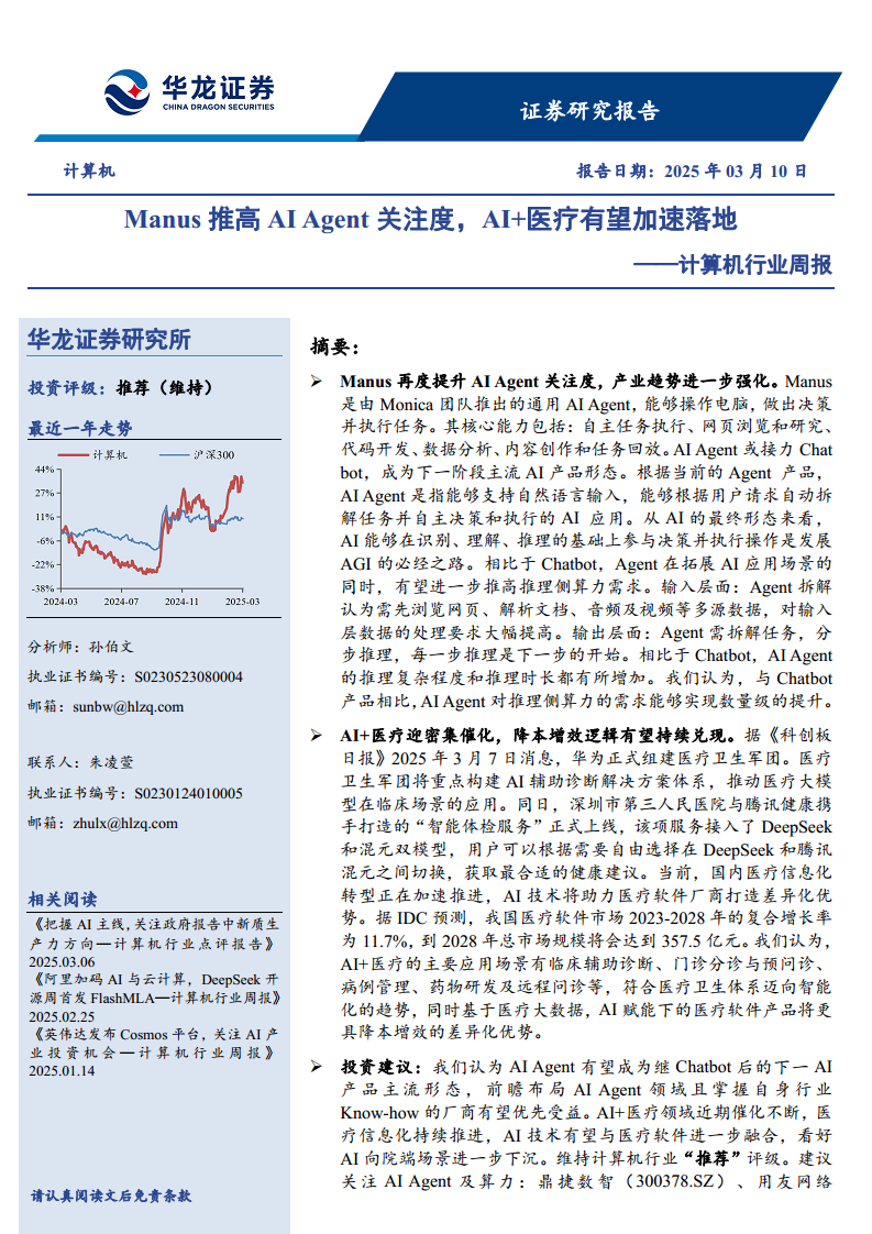 计算机行业周报:Manus推高AI Agent关注度,AI+医疗有望加速落地