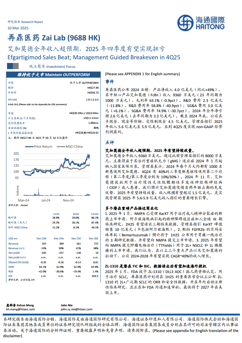 再鼎医药2024年业绩表现强劲,核心产品艾加莫德(Efgartigimod)全年收入达到9360万美元,远超管理层此前8000万美元的指引,主要得益于其重症肌无力(gMG)适应症纳入国家医保目录。公司产品净收入同比增长49%至4.0亿美元,净亏损同比收窄。管理层预计2025年收入将达到5.6亿至5.9亿美元,并有望在2025年第四季度实现non-GAAP经营利润盈利,标志着公司迈向盈利的关键转折点。