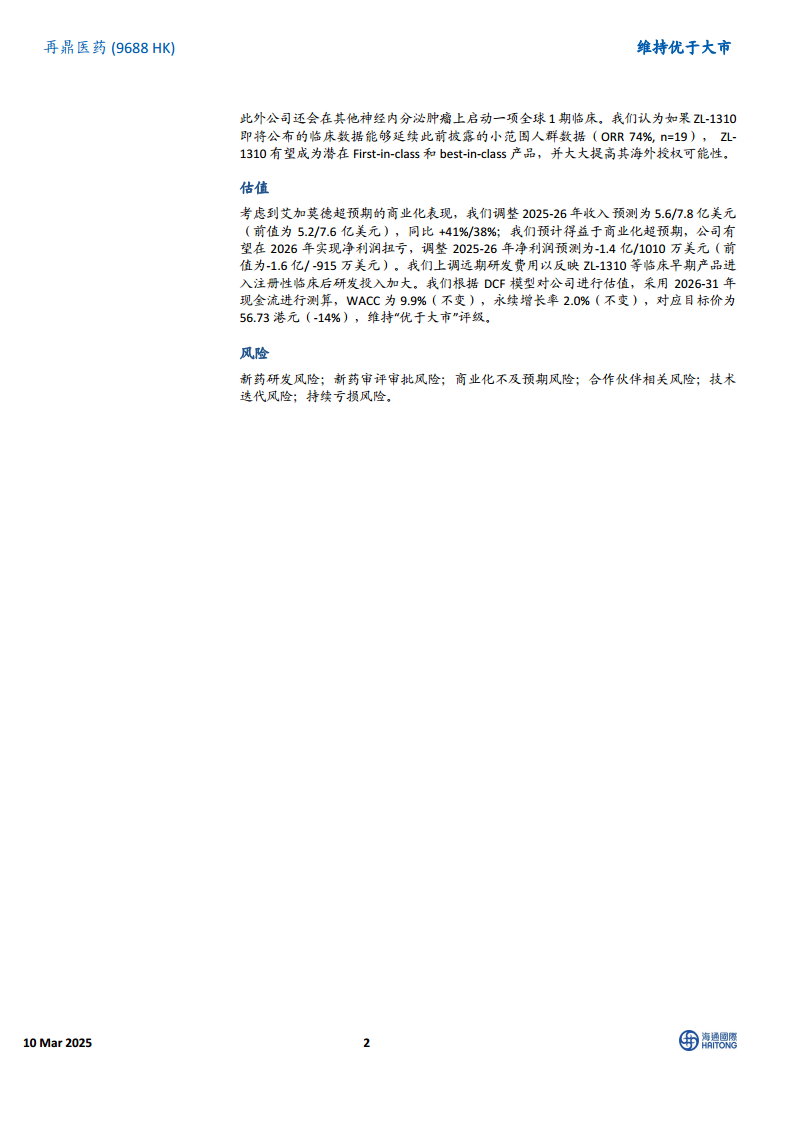 鉴于艾加莫德超预期的商业化表现,海通国际调整了再鼎医药2025-2026年的收入预测,分别上调至5.61亿美元和7.75亿美元(原预测为5.18亿美元和7.59亿美元),同比增长41%和38%。受益于商业化超预期,公司有望在2026年实现净利润扭亏为盈,因此将2025-2026年净利润预测调整为-1.4亿美元和1010万美元(原预测为-1.59亿美元和-900万美元)。同时,为反映ZL-1310等临床早期产品进入注册性临床后研发投入的增加,上调了远期研发费用。基于DCF模型估值,采用2026-2031年现金流测算,WACC为9.9%(不变),永续增长率2.0%(不变),对应目标价为56.73港元(-14%),维持“优于大市”评级。报告提示了新药研发风险、新药审评审批风险、商业化不及预期风险、合作伙伴相关风险、技术迭代风险以及持续亏损风险。