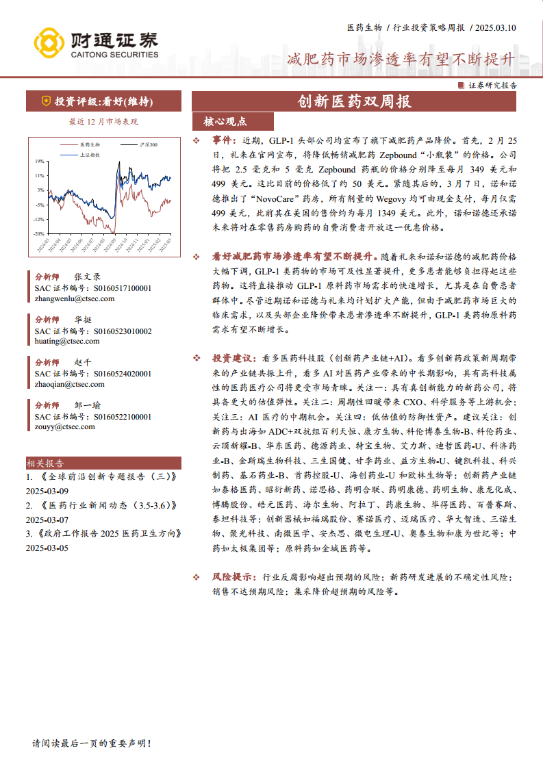 本报告分析指出,随着GLP-1类减肥药价格大幅下调,市场可及性显著提升,预计将推动该类药物的市场渗透率和原料药需求持续增长。在医药板块整体表现方面,医药生物行业估值相对合理,但近期涨幅略低于大盘。投资策略建议关注创新药产业链与AI技术融合带来的高科技属性医药医疗公司的投资机会,并警示行业反腐、新药研发不确定性、销售不及预期及集采降价超预期等风险。同时,全球范围内多项创新疗法在肿瘤、眼科、疼痛管理和过敏等领域取得积极进展,预示着医药科技创新的蓬勃发展。
