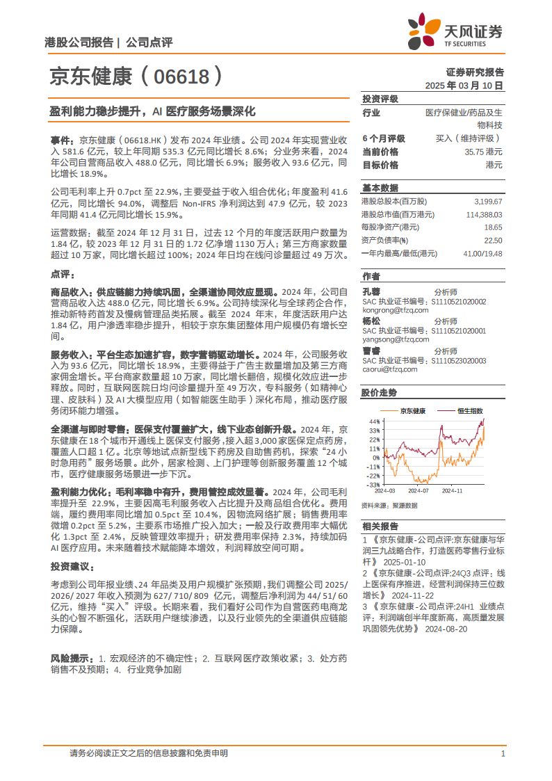 京东健康的增长并非仅仅依赖于单一业务,而是得益于其多元化的战略布局和业务模式的深化。在商品收入方面,公司通过持续巩固供应链能力,与全球药企深化合作,成功推动了新特药的首发和慢病管理品类的拓展,确保了自营商品业务的稳定增长(488.0亿元,同比增长6.9%)。同时,服务收入作为高增长引擎,实现了18.9%的显著增长,达到93.6亿元,这主要得益于平台生态的加速扩容,包括第三方商家数量的翻倍增长(超过10万家)和数字营销的有效驱动。在用户层面,年度活跃用户数量达到1.84亿,净增1130万人,显示出强大的用户吸引力和留存能力。公司还积极深化AI医疗服务场景,如智能医生助手,并扩大全渠道与即时零售布局,通过线上医保支付覆盖18个城市和线下创新业态(如新型线下药房和自助售药机),旨在构建更完善的医疗服务闭环,提升用户体验和市场渗透率。这些战略举措共同构成了京东健康未来持续增长的核心驱动力,也支撑了分析师对其“买入”评级的维持,并看好其作为自营医药电商龙头的长期发展潜力。