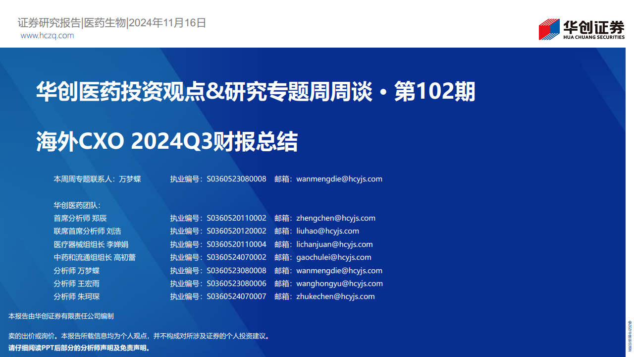 华创医药投资观点&研究专题周周谈第102期:海外CXO2024Q3财报总结