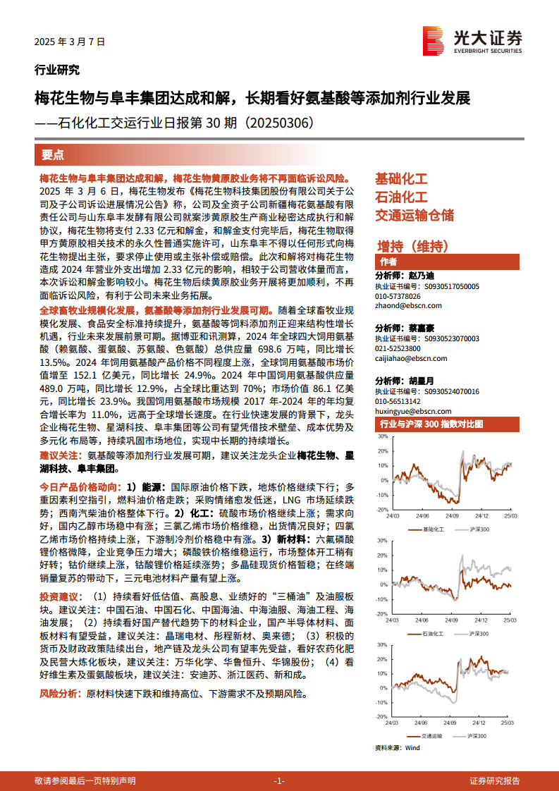 石化化工交运行业日报第30期:梅花生物与阜丰集团达成和解,长期看好氨基酸等添加剂行业发展