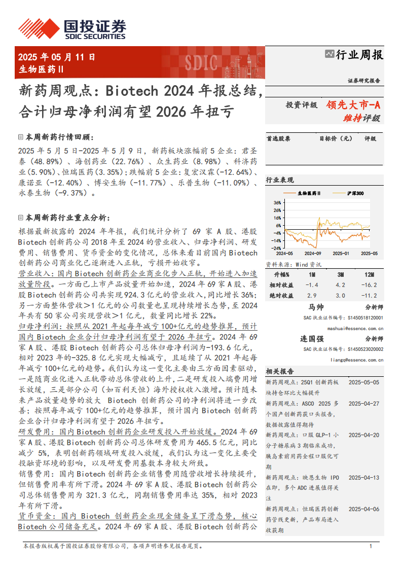 新药周观点:Biotech2024年报总结,合计归母净利润有望2026年扭亏