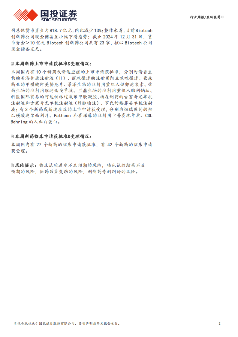 本周行业周报对Biotech创新药行业2024年年报进行了深入分析,揭示了国内Biotech企业商业化进程加速、财务状况显著改善的积极趋势。报告指出,2024年行业营收实现36%的强劲增长,亏损大幅收窄,并有望在2026年实现整体扭亏为盈。尽管研发投入增速放缓且现金储备略有下降,但核心Biotech公司仍保持充足的资金实力。此外,本周新药上市和临床申请的批准与受理情况显示,行业创新活力持续,产品管线不断丰富。整体而言,国内Biotech创新药行业正朝着更加健康和可持续的方向发展。