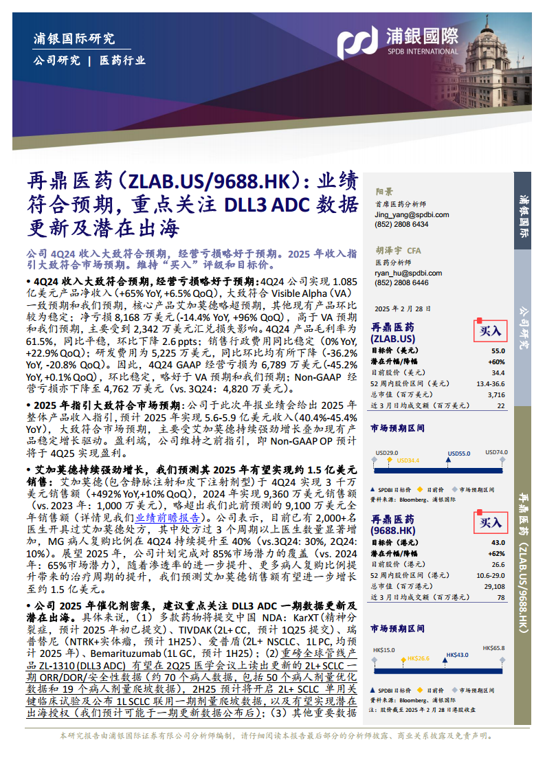 核心产品艾加莫德持续实现强劲增长,预计2025年销售额将进一步显著提升。同时,公司在2025年将迎来多款创新药物在中国的新药上市申请(NDA)提交,以及重磅管线ZL-1310 (DLL3 ADC) 的关键临床数据更新和潜在的海外授权机会,这些密集催化剂有望为公司未来的发展提供强大动力。