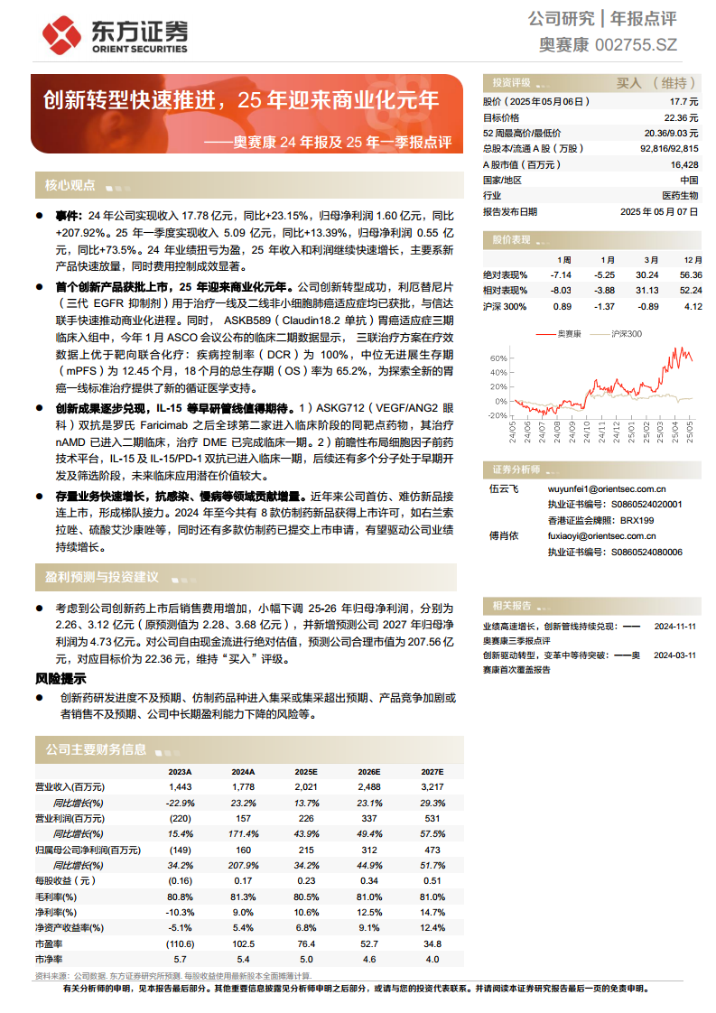 鉴于公司创新转型快速推进,创新成果逐步兑现,且仿制药业务保持稳健增长,东方证券研究所维持对奥赛康的“买入”评级。