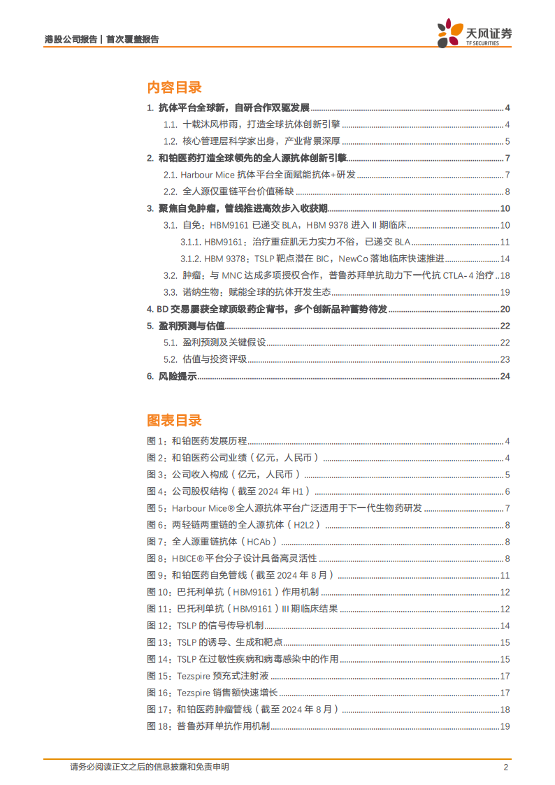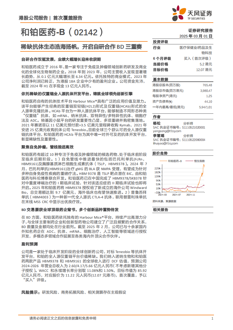 公司主营收入从2018年的0.1亿元人民币大幅增长至2023年的6.34亿元人民币,并于2023年实现净利润转正,成为港股18A企业中少数盈利的企业,截至2024年H1在手现金充沛达13亿元人民币。基于其强大的研发实力、高效的管线推进(如巴托利单抗HBM9161已递交BLA,HBM9378进入II期临床并达成9.7亿美元授权交易)以及成功的BD策略,公司预计2024-2026年营业总收入将持续增长。天风证券首次覆盖给予“买入”评级,目标价格为12.07港元,反映了市场对其稀缺平台价值和未来增长潜力的认可。