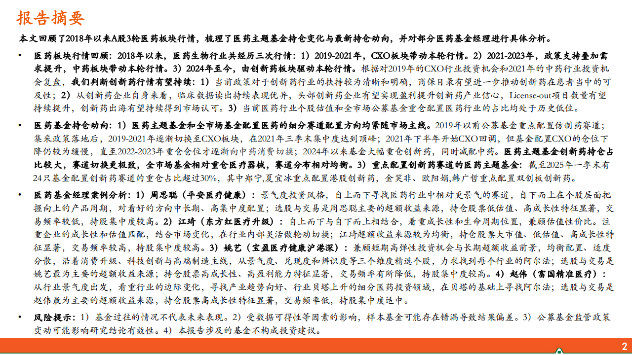 医药主题基金和全市场基金的持仓方向均紧密跟随市场主线,近年来大幅增配创新药。报告通过对多位医药基金经理的案例分析,展示了其在景气度判断、个股选择、交易策略及持仓风格上的差异,强调了优秀基金经理在把握行业贝塔基础上获取阿尔法收益的能力。