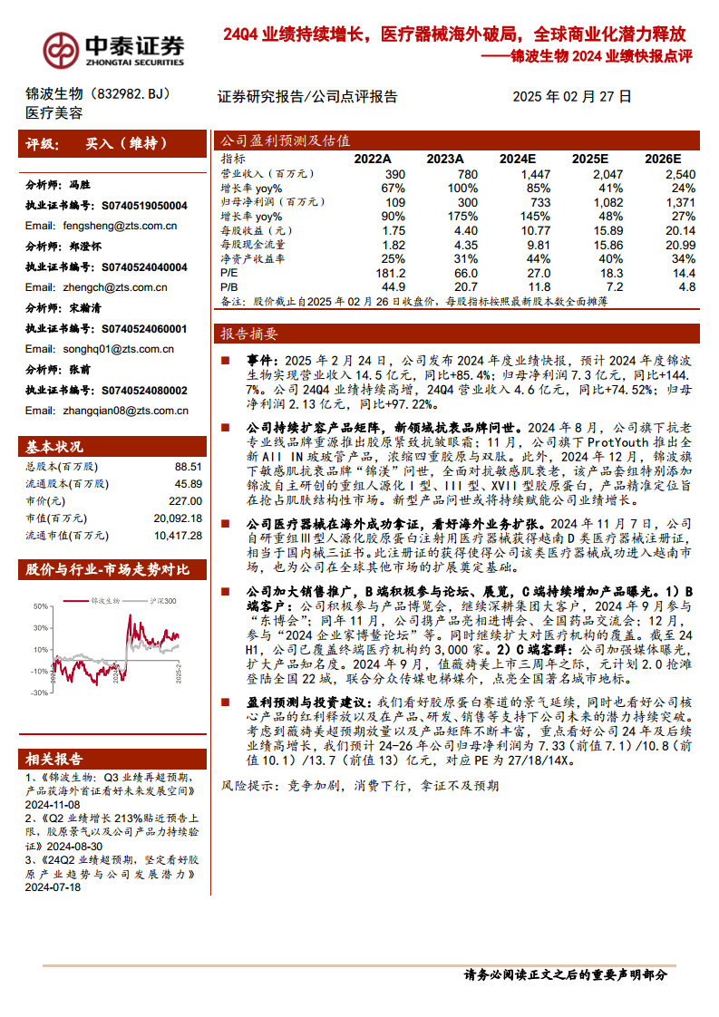 锦波生物在2024年取得了显著的业绩增长,营业收入和归母净利润均实现高速增长,尤其第四季度表现强劲。公司通过持续扩容产品矩阵,推出多款创新抗衰品牌,并成功实现医疗器械在海外市场的突破,获得越南注册证,为全球商业化奠定了基础。同时,公司积极深化B端和C端销售推广策略,有效扩大了市场覆盖和品牌影响力。分析师对公司未来发展持乐观态度,认为其在胶原蛋白领域的领先地位和持续创新能力将驱动业绩持续高增长,维持“买入”评级。