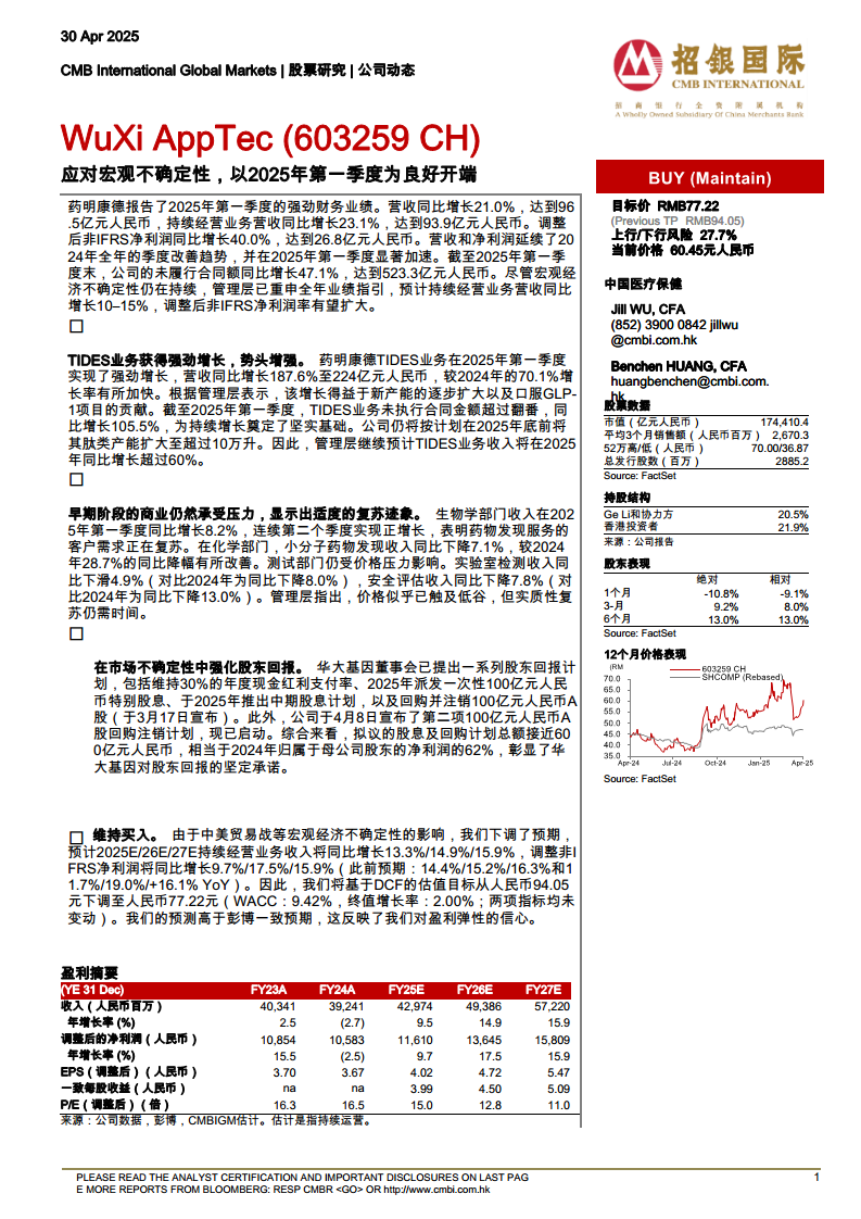 本报告的核心观点在于,药明康德在宏观挑战下,通过其TIDES等创新业务的强劲增长,有效对冲了部分早期阶段商业板块的压力,并展现出整体的盈利韧性。公司不仅在业务层面实现了高质量增长,尤其是在肽类和寡核苷酸药物研发生产服务领域,而且在资本市场层面,通过高达600亿元人民币的股东回报计划,积极回馈投资者,彰显了其稳健的财务状况和对股东价值的重视。尽管分析师因宏观不确定性下调了未来盈利预测和目标价,但仍维持“买入”评级,并对公司盈利弹性抱有信心。
