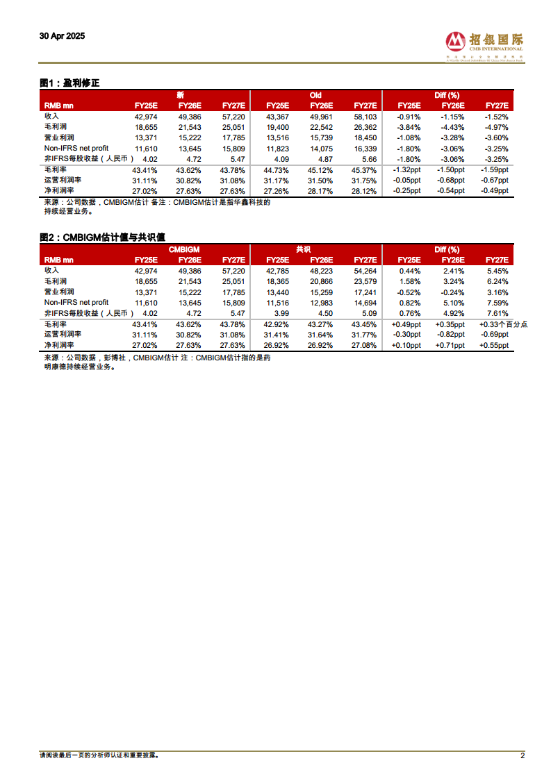 具体而言,分析师下调了对2025E/26E/27E持续经营业务收入的同比增长预测,分别调整为13.3%/14.9%/15.9%(此前预期为14.4%/15.2%/16.3%)。同时,调整后非IFRS净利润的同比增长预测也相应下调至9.7%/17.5%/15.9%(此前预期为11.7%/19.0%/16.1%)。从盈利修正表中可以看出,收入、毛利润、营业利润和非IFRS净利润的预测值均有小幅下调,毛利率、运营利润率和净利润率也略有下降。