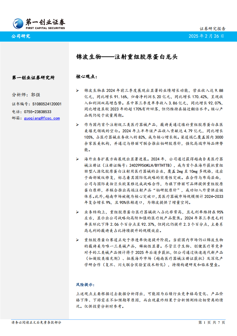 锦波生物在2024年前三季度展现出卓越的业绩增长,营业收入和归母净利润均实现大幅提升,主要得益于其核心产品——国内首个注射级三类医疗器械“薇旖美”的强劲市场表现和高毛利贡献。公司成功将战略重心聚焦于高附加值的重组胶原蛋白医疗器械,并通过差异化产品策略和广泛的渠道覆盖,巩固了在国内医美市场的领先地位。在国际化方面,锦波生物取得了实质性突破,获得越南D类医疗器械注册证,并与欧莱雅等国际巨头建立战略合作,成功切入全球供应链,为未来的海外扩张奠定了基础。尽管面临行业竞争加剧的风险,但公司凭借其技术领先优势、持续的研发投入和前瞻性的市场布局,已构建起坚实的竞争壁垒,并展现出持续增长的潜力。