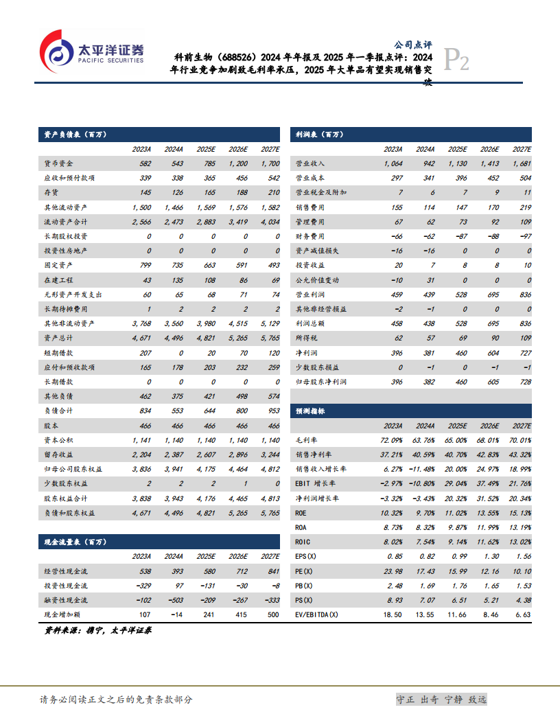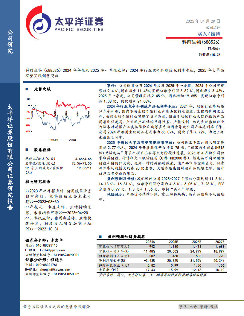 科前生物在2024年面临行业竞争加剧和毛利率承压的挑战,导致业绩短期下滑。然而,公司在2025年第一季度已展现出强劲的业绩复苏势头。凭借持续的研发投入和独家大单品“猪瘟、猪伪狂犬二联活疫苗”的推出,公司有望在2025年实现销售突破,驱动未来业绩持续增长。太平洋证券基于对公司未来营收和净利润的乐观预测,维持“买入”评级,认为公司具备长期投资价值,但投资者仍需关注产品价格波动、动物疾病风险及新产品销售情况。