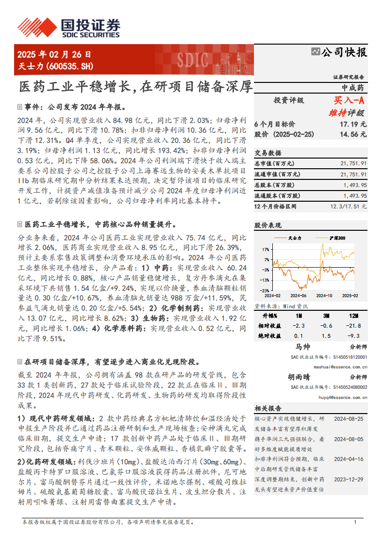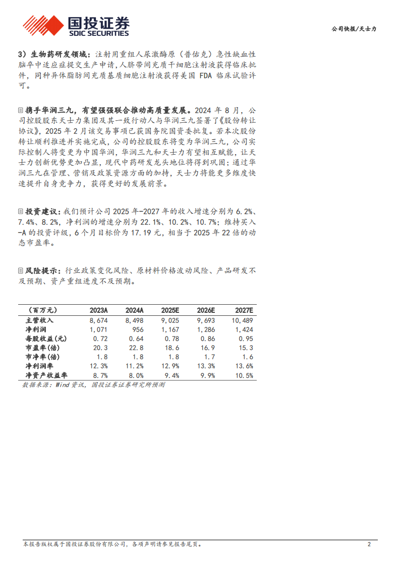 天士力在2024年虽然受到一次性资产减值准备的影响导致归母净利润下滑,但其核心医药工业板块,特别是中药产品,展现出稳健的增长态势和市场韧性。公司在现代中药、化药和生物药领域拥有深厚的研发管线,多项创新成果正逐步走向商业化,为未来业绩增长奠定基础。此外,与华润三九的战略合作将为天士力带来管理、营销和政策资源等多方面的赋能,有望显著提升其市场竞争力和长期发展潜力。分析师预计公司未来几年收入和净利润将恢复增长,维持“买入-A”评级。