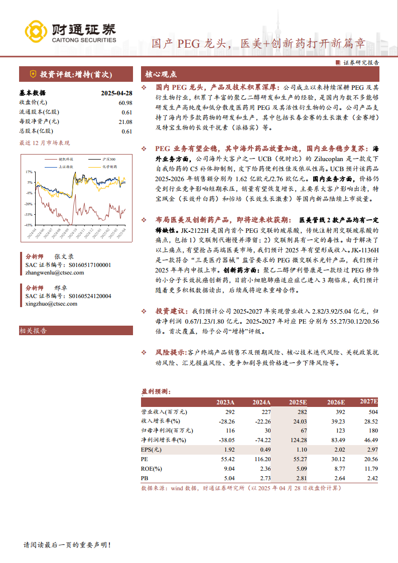 公司在医美领域推出的两款稀缺产品——PEG交联玻尿酸JK-2122H和符合“三类医疗器械”监管要求的水光针JK-1136H,预计将抢占高端市场并受益于监管红利,有望在2025年开始贡献收入。同时,创新药聚乙二醇伊利替康在小细胞肺癌适应症上已进入三期临床,其优异的临床前和二期数据预示着巨大的市场潜力。随着海外药品业务的加速放量和国内新产品的陆续上市,公司业绩有望在2025-2027年实现显著增长,归母净利润预计分别达到0.67亿元、1.23亿元和1.80亿元,对应PE分别为55.27倍、30.12倍和20.56倍,首次覆盖给予“增持”评级。