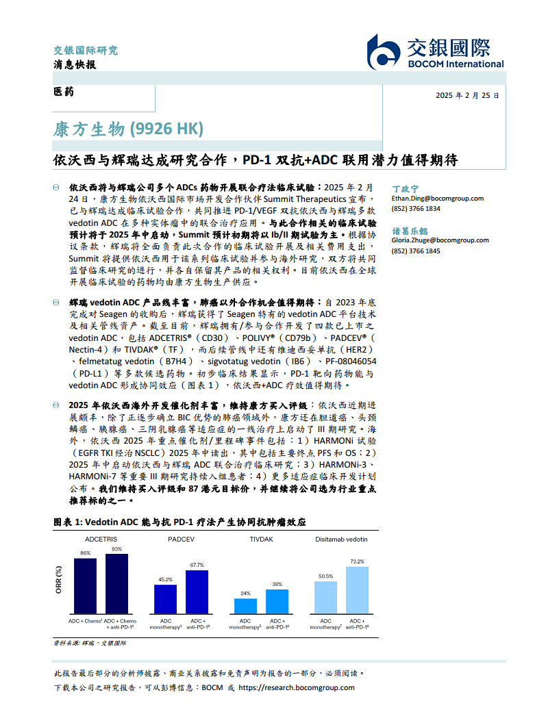 本报告的核心观点在于,康方生物(9926 HK)的PD-1/VEGF双特异性抗体依沃西(Ivonescimab)与全球制药巨头辉瑞公司达成临床试验合作,共同探索依沃西与辉瑞多款vedotin ADC(抗体药物偶联物)在多种实体瘤中的联合治疗应用,标志着肿瘤免疫治疗与靶向治疗结合的新范式。此次合作不仅彰显了依沃西作为“同类最佳”(BIC)药物的潜力,更预示着其在肺癌以外的广阔适应症领域,通过与具有协同效应的ADC药物联用,有望为患者带来更优的治疗选择。辉瑞在ADC领域的深厚积累和依沃西的创新机制相结合,为未来肿瘤治疗提供了新的想象空间。