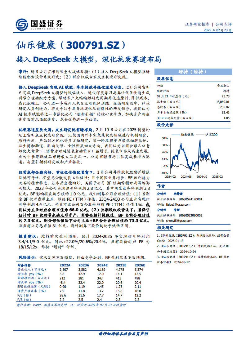 仙乐健康通过战略性接入DeepSeek大模型以提升研发效率和降低成本,并前瞻性地成立抗衰研究院以深耕高增长潜力的抗衰老市场,展现了其在营养健康领域的创新驱动和市场布局能力。尽管美国子公司BF短期亏损对业绩有所拖累,但公司内生业务稳健增长,股权激励计划有效激发了经营活力。基于对公司主业和BF业务的估值分析,当前股价被认为处于低估区间,具备显著的投资价值。预计未来三年公司归母净利润将保持超过20%的复合增长,维持“增持”评级。投资者需关注需求复苏、行业竞争及BF盈利改善等潜在风险。