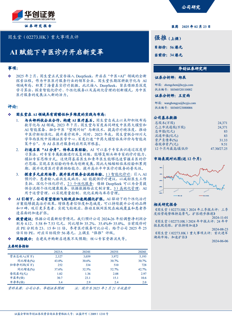 华创证券基于固生堂最新的经营情况,对其未来业绩增长持乐观态度。预计公司2024-2026年经调整净利润将分别实现35.2%、35.4%和35.0%的同比高增长。在AI赋能下,公司有望借助“飞轮效应”加速规模化扩张,持续提升品牌影响力和患者忠诚度。鉴于此,华创证券上调固生堂投资评级至“强推”,并设定目标价为56港元,显示出对公司未来发展潜力的充分认可。