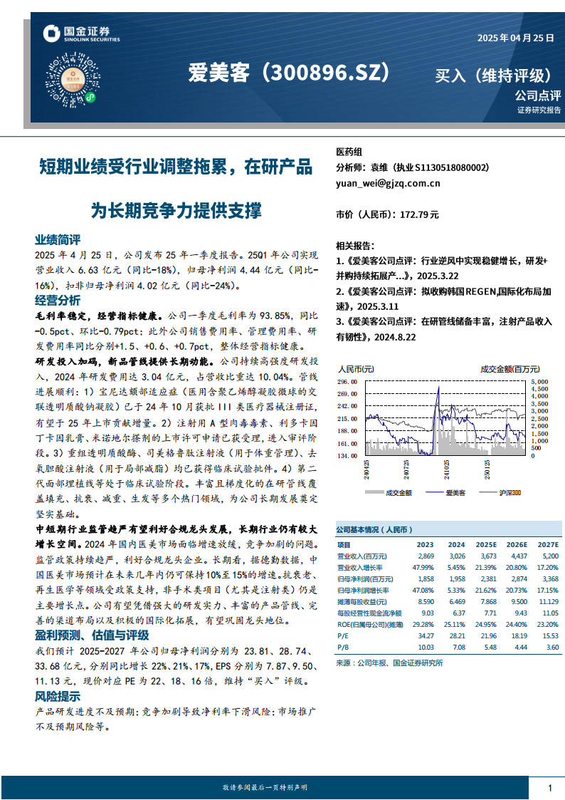尽管公司2025年第一季度业绩面临短期压力,但其核心经营指标保持健康,毛利率稳定。公司持续高强度的研发投入已构建起覆盖多热门领域的丰富产品管线,为未来增长提供了强劲动能。医美行业中短期监管趋严有利于合规龙头企业,而长期市场仍有10%-15%的增长空间。公司凭借其综合优势,有望巩固市场领导地位。分析师预计公司未来三年归母净利润将保持20%左右的增速,并维持“买入”评级。