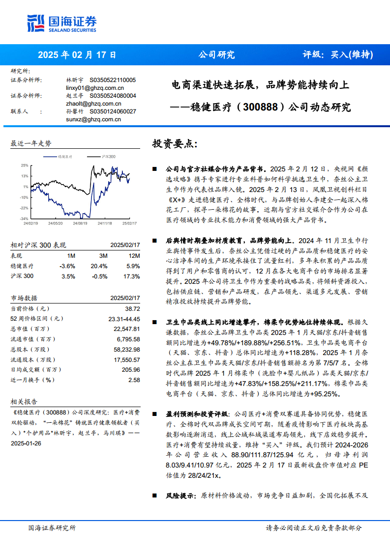 稳健医疗凭借其独特的“医疗+消费”双轮驱动战略,在品牌建设和电商渠道拓展方面取得了显著成效。通过与官方媒体的合作,公司有效提升了品牌公信力和市场影响力。在行业舆情事件后,奈丝公主品牌凭借卓越品质成功抓住市场机遇,实现了电商销售额的爆发式增长,而全棉时代棉柔巾也持续保持其优势地位。尽管面临原材料价格波动和市场竞争加剧等风险,但公司强劲的增长势头、领先的线上渠道布局以及清晰的战略规划,使其盈利能力和市场前景持续向好,国海证券维持“买入”评级。