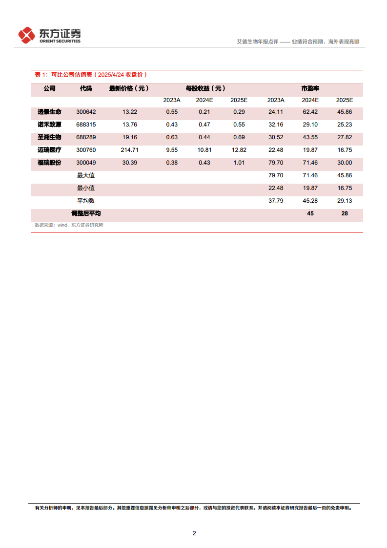 基于2024年年报及2025年一季报,分析师下调了公司2025-2027年的收入和毛利率假设,预测每股收益(EPS)分别为0.81元、0.98元和1.19元。根据可比公司2025年平均估值,给予公司2025年28倍市盈率,对应目标价为22.68元,并维持“增持”评级。报告同时提示了新产品推广不及预期、海外地缘政治影响国际拓展以及药企合作业务进展不及预期等风险。