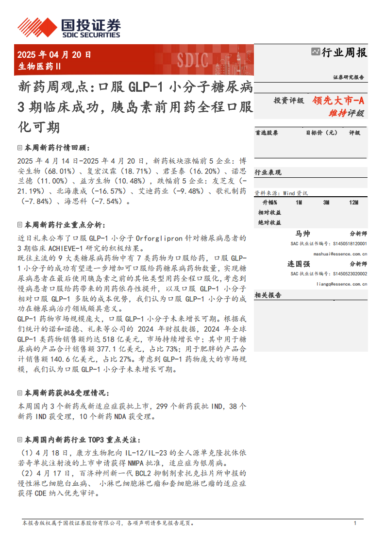 新药周观点:口服GLP-1小分子糖尿病3期临床成功,胰岛素前用药全程口服化可期