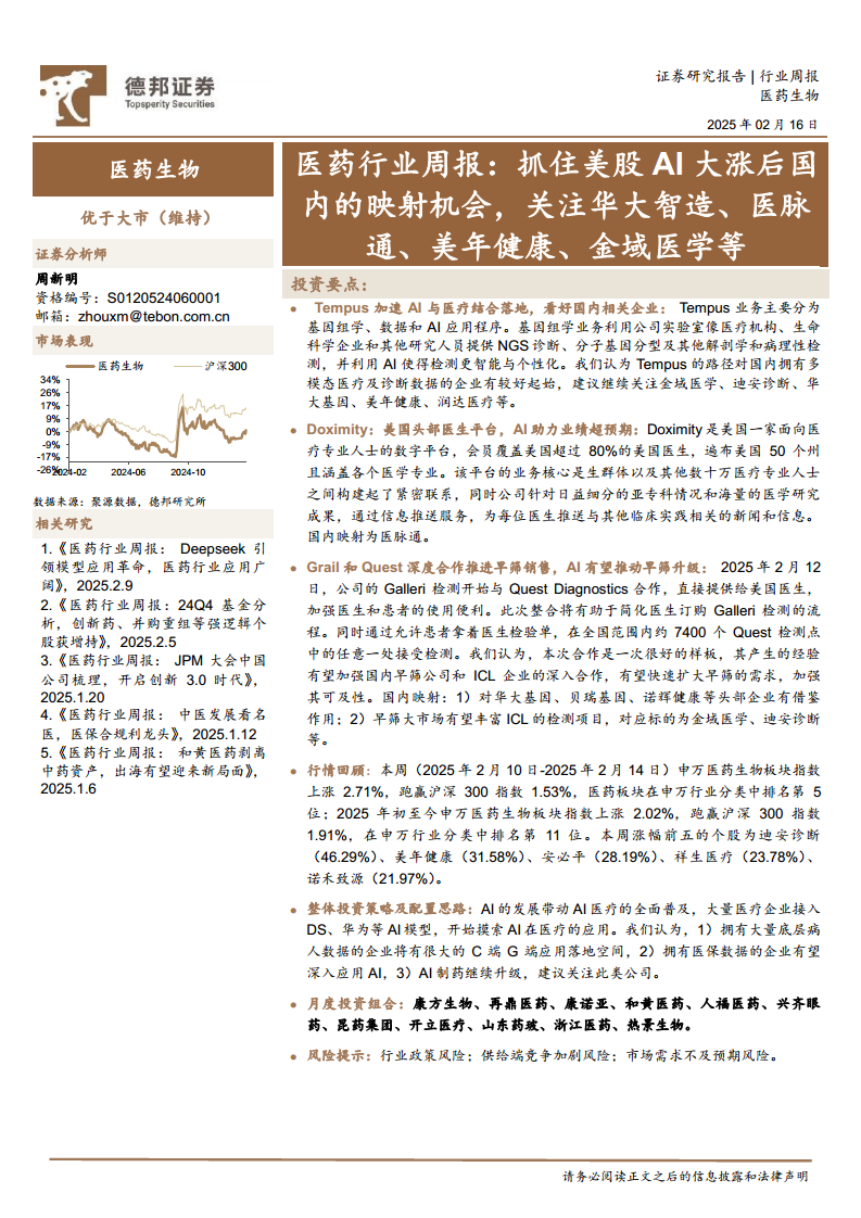 在市场行情方面,本周(2025年2月10日-2025年2月14日)申万医药生物板块指数表现稳健,跑赢沪深300指数,并在申万行业分类中位居前列,显示出较强的韧性。报告建议投资者抓住AI医疗的长期趋势,并结合短期市场表现,对具备核心数据优势和创新能力的医药企业进行战略配置。月度投资组合推荐了康方生物、再鼎医药等一系列创新药、眼科、中药及器械领域的优质标的,以期在行业变革中把握增长机会。