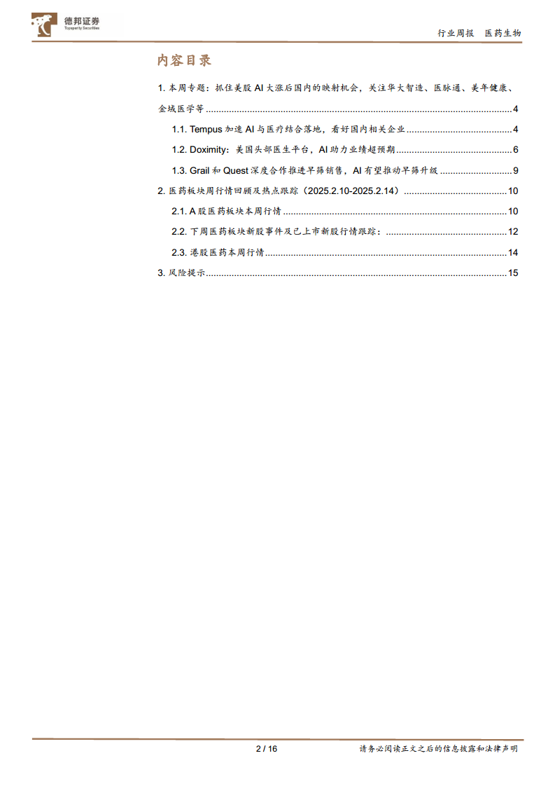 本报告深入分析了美股AI概念股大涨后对国内医药生物行业的映射机会,强调了人工智能在医疗领域的巨大潜力和应用前景。通过对Tempus、Doximity和Grail等美国领先案例的剖析,报告明确了AI在基因组学、医生协作平台和癌症早筛等方面的成功模式,并为国内相关企业如金域医学、迪安诊断、华大基因、美年健康、医脉通、诺辉健康等指明了发展方向和投资价值。