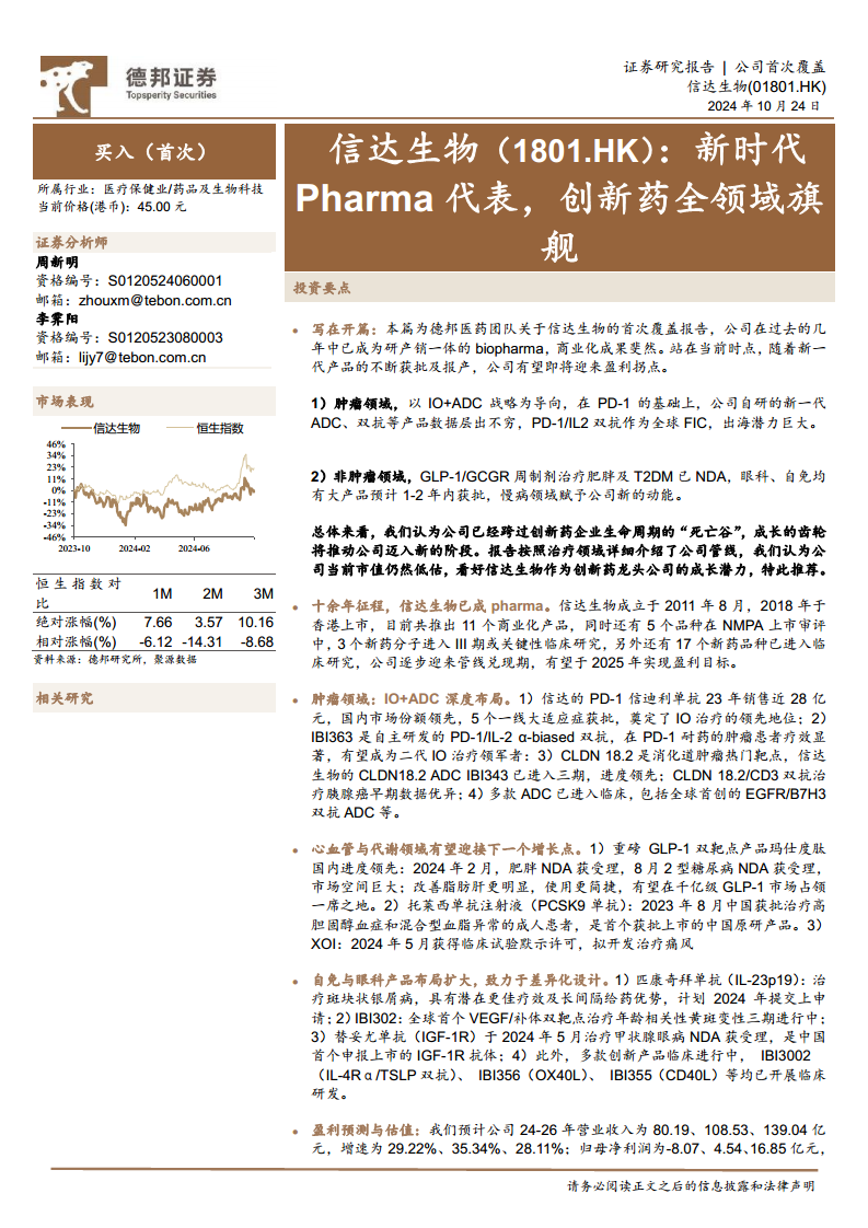 - 研发: 信达生物高度重视新药研发及技术平台建设,已打造贯穿生物创新药开发全周期的高质量技术平台,包括先进、高效、全面的单克隆抗体生物药研发系统、差异化的ADC技术平台和完整的创新药物临床研究运营平台。近年来,公司研发开支稳定在20亿元级别,研发费用率持续降低。公司管线组合丰富,涵盖肿瘤和综合产品线,其中肿瘤管线有9款获批上市,综合产品线有2款商业化。