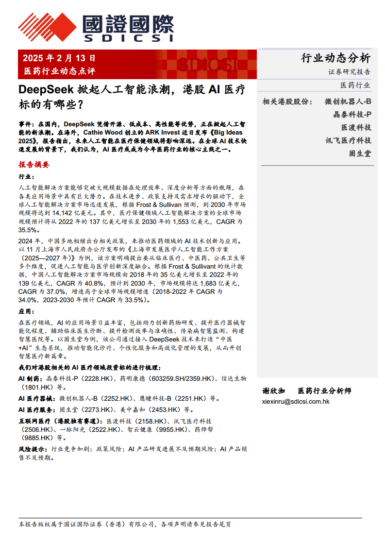 医药行业动态点评:DeepSeek掀起人工智能浪潮,港股AI医疗标的有哪些?