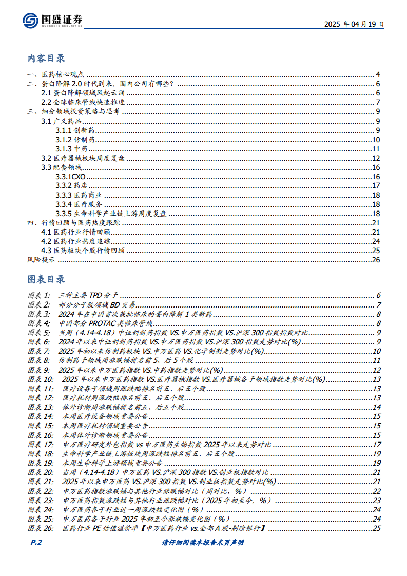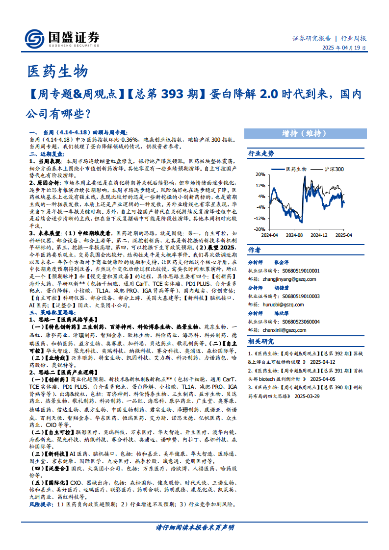 当周(4.14-4.18)回顾与周专题: 申万医药指数环比下跌0.36%,表现优于创业板指数但逊于沪深300指数。本周专题深入探讨了蛋白降解领域。