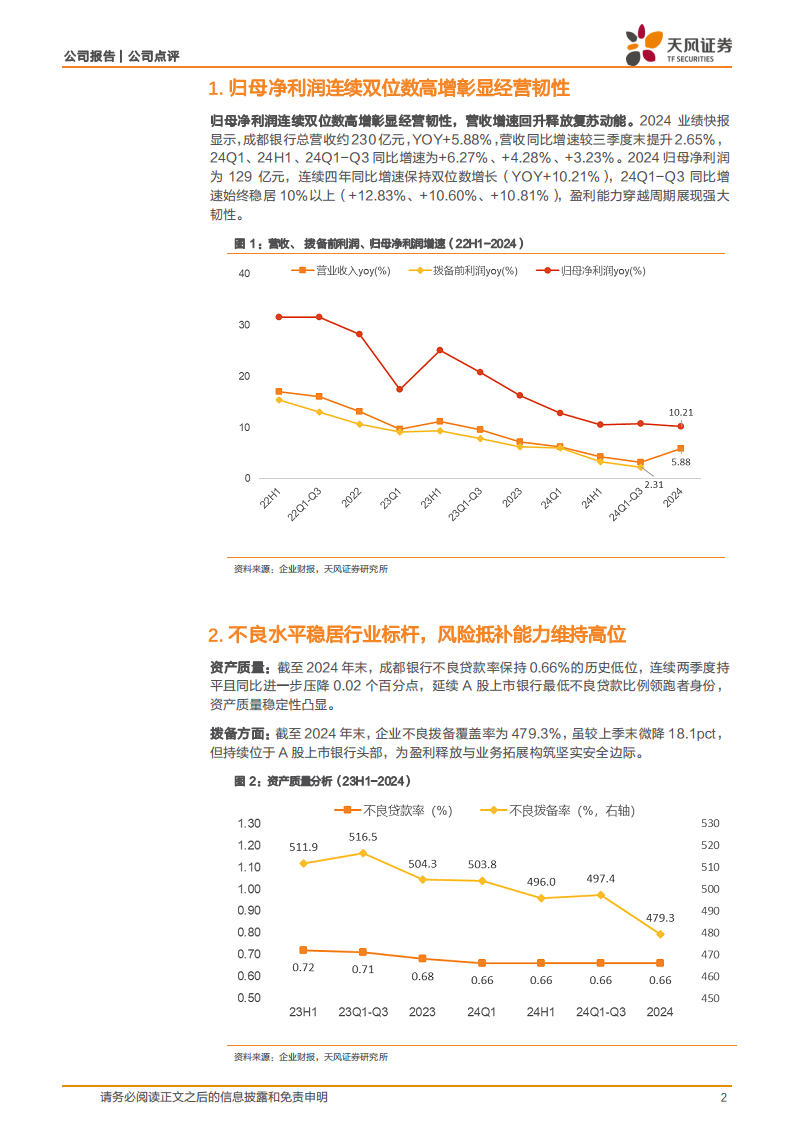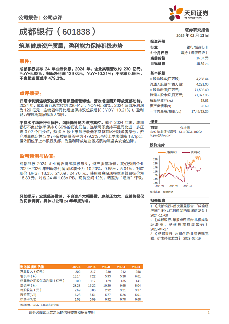 成都银行2024年业绩快报展现了其稳健的经营态势和卓越的风险控制能力。公司归母净利润连续四年实现双位数增长,营收增速回升,盈利能力持续强劲。同时,不良贷款率保持行业最低水平,拨备覆盖率维持高位,资产质量健康且风险抵补能力充裕。基于对公司未来盈利增长的积极预期,分析师给予“增持”评级,并设定目标价18.89元,表明其投资价值。