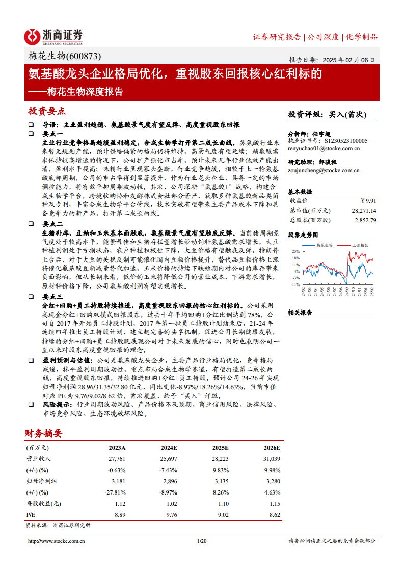 梅花生物作为氨基酸和味精行业的领军企业,通过持续优化主业竞争格局、深耕合成生物学领域,并积极应对宏观经济及农产品周期性变化,展现出稳健的盈利能力和多元化的成长潜力。公司在苏氨酸和赖氨酸市场占据主导地位,并通过扩产和技术创新进一步巩固市场份额,同时受益于生猪存栏增长、玉米价格下跌带来的成本优势以及豆粕价格反弹预期,为氨基酸产品量价齐升奠定基础。