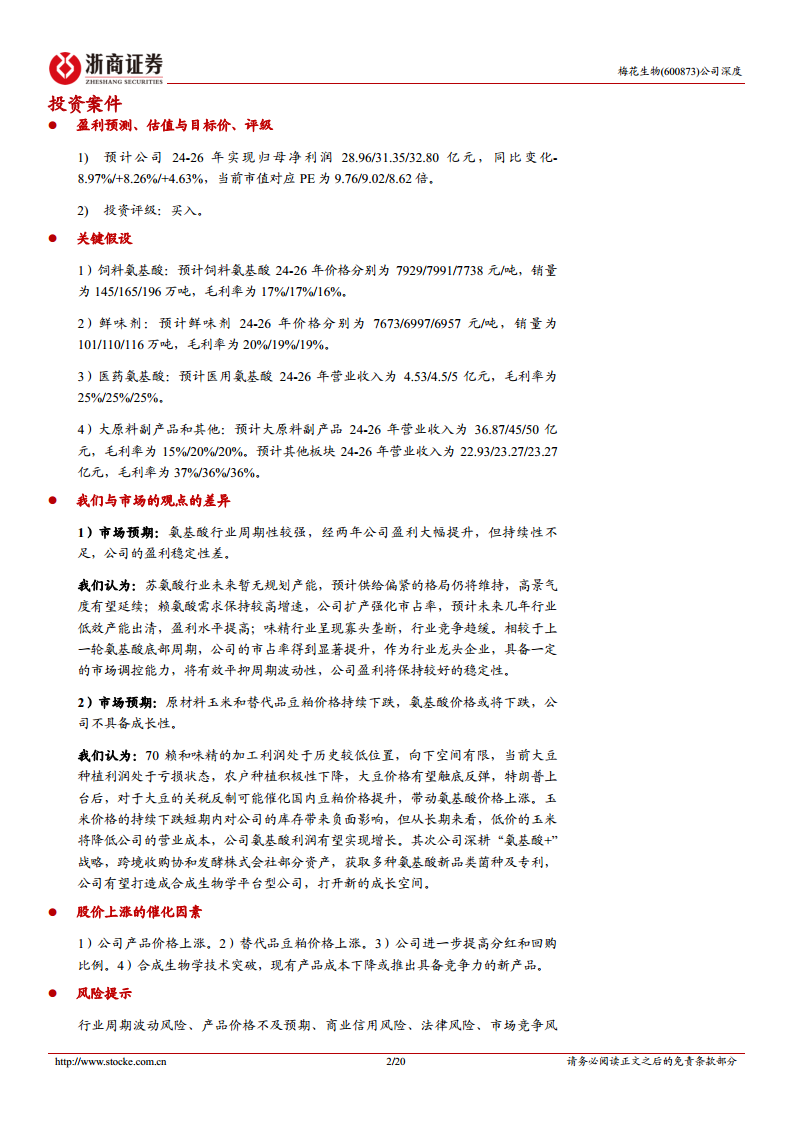 饲料氨基酸: 包含赖氨酸、苏氨酸、色氨酸、缬氨酸等产品。受益于豆粕减量替代带来的需求增长以及公司赖氨酸产能的投产,预计销量将持续增长。预计2024-2026年价格分别为7929/7991/7738元/吨,销量分别为145/165/196万吨,毛利率分别为17%/17%/16%。 鲜味剂: 包含味精和I+G等产品。味精行业集中度高,公司产能逐步投放(主要为置换),下游需求稳定,且当前价格已逼近底部,进一步下行风险有限。预计2024-2026年价格分别为7673/6997/6957元/吨,销量分别为101/110/116万吨,毛利率分别为20%/19%/19%。 医用氨基酸: 包含谷氨酰胺、脯氨酸、亮氨酸、异亮氨酸等产品。该领域存在较高的产品技术壁垒和认证壁垒,行业格局稳定且需求稳步增长。预计公司产品价格和毛利率将维持在较高水平,2024-2026年营业收入分别为4.53/4.5/5亿元,毛利率均为25%。 大原料副产品: 包含肥料、蛋白粉、胚芽、玉米皮粉、饲料纤维等。受益于公司氨基酸和鲜味剂产能的增长