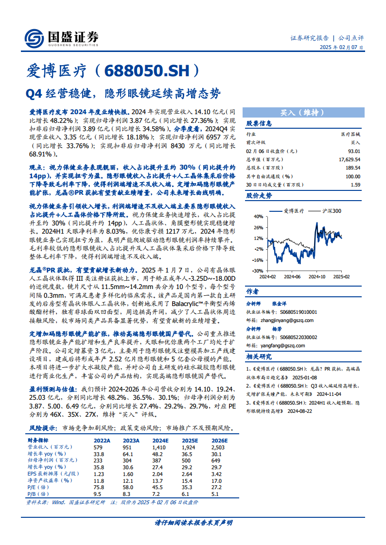 爱博医疗2024年业绩表现稳健,营收和归母净利润均实现快速增长,其中视力保健业务,特别是隐形眼镜业务,贡献突出并成功实现扭亏为盈,显示出良好的增长势头和业务结构优化。公司通过“龙晶®PR”的获批上市,进一步丰富了高端产品线,并借助定增募资积极扩张隐形眼镜产能,旨在推动高端医疗器械的国产替代。尽管毛利率受产品结构变化和集采影响有所下降,但公司明确的创新和产能扩张战略预示着未来业绩的持续增长潜力。国盛证券维持“买入”评级,并提示了市场竞争、政策变动和市场推广等潜在风险。