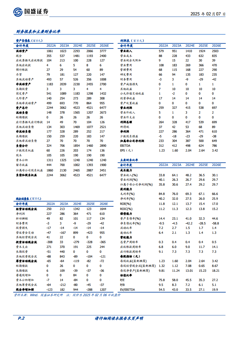 国盛证券预计2024-2026年公司营收分别为14.10亿元、19.24亿元、25.03亿元,分别同比增长48.2%、36.5%、30.1%;归母净利润分别为3.87亿元、5.00亿元、6.49亿元,分别同比增长27.4%、29.2%、29.7%。对应PE分别为46X、35X、27X,维持“买入”评级。