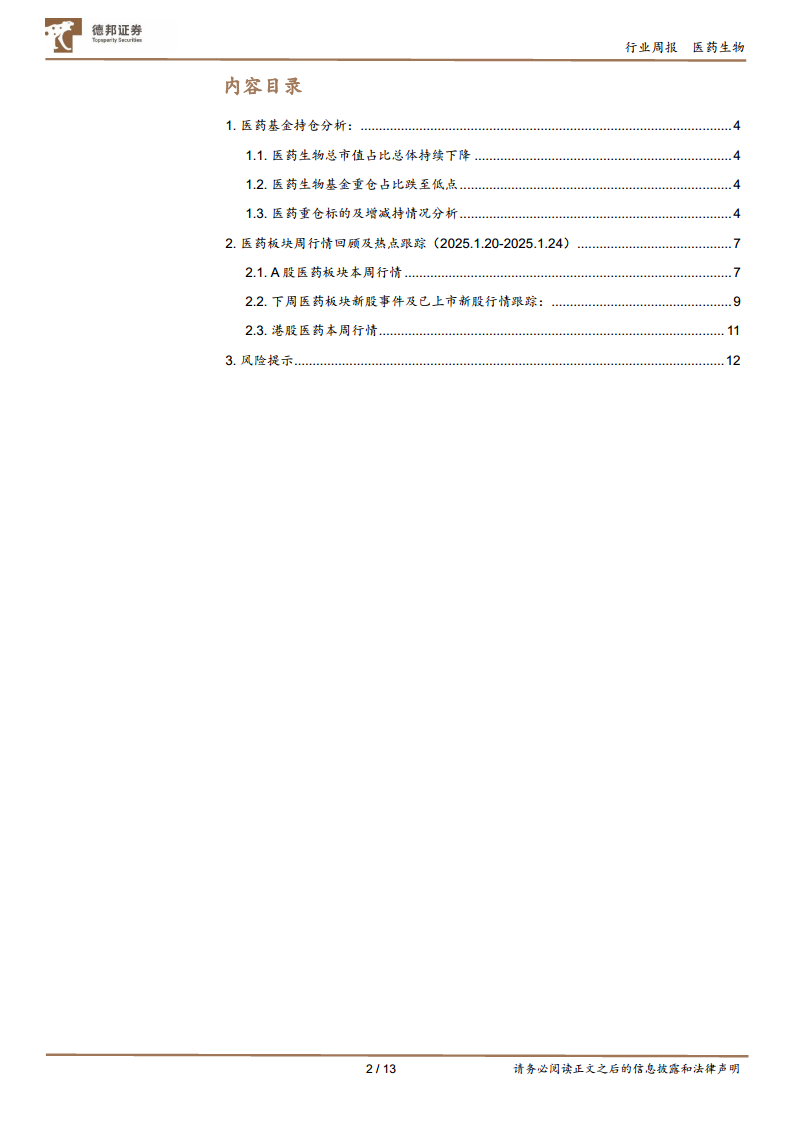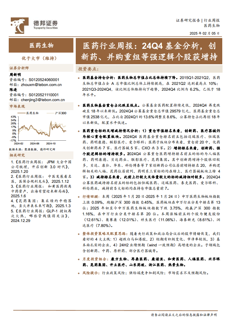 医药行业周报:24Q4基金分析,创新药、并购重组等强逻辑个股获增持