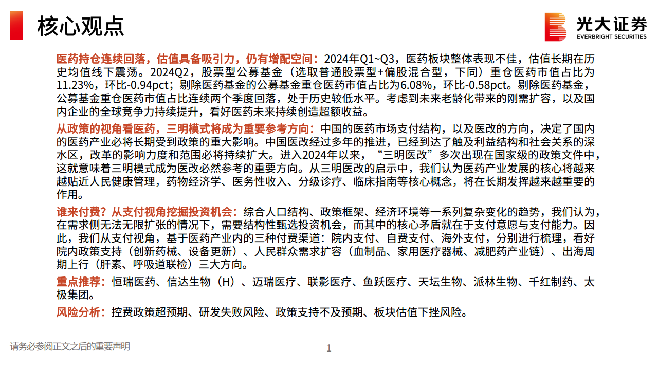 本报告核心观点指出,2024年前三季度医药板块表现不佳,估值长期处于历史均值以下,公募基金重仓医药市值占比连续两个季度回落至历史较低水平(2024Q2剔除医药基金后为6.08%,环比-0.58pct)。然而,考虑到中国老龄化带来的刚性需求扩容以及国内企业全球竞争力的持续提升,医药板块未来仍具备持续创造超额收益的潜力,估值吸引力显著,存在增配空间。