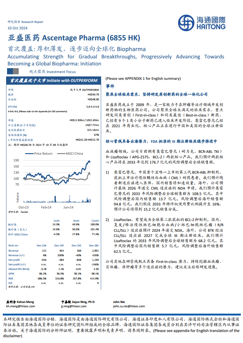- 核心产品销售潜力巨大: 奥雷巴替尼(BCR-ABL TKI)和Lisaftoclax(APG-2575,BCL-2)是公司的两大核心产品。报告预计,到2033年,这两款产品将实现176.7亿元人民币的风险调整后全球销售额。奥雷巴替尼作为中国首个且唯一上市的第三代BCR-ABL抑制剂,预计2033年全球销售额将达108.5亿元;Lisaftoclax有望成为全球第二款获批的BCL-2抑制剂,预计2033年全球销售额将达68.2亿元。